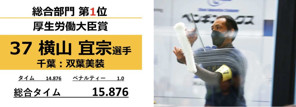 本大会は、1040mm×1150mmの窓枠付き板ガラス(3枚)を、より早く、よりきれいに拭き上げる技術を競う全国規模の競技大会です。横山は、総合タイム15.876秒という圧倒的な成績で栄冠を手にしました。